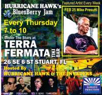 BluesBerry Jam has become the premier blues jam in South Florida and is hosted by HURRICANE HAWK & THE INVADERS: Hawk Levy, Steve Bolanda, Mike Loschiavo and Pete St. George. Professional blues artists are always welcome to sit in, but space is limited, arrive early to sign "the list". Each week also includes a special guest star. This week we have guest MIKE PRESUTTI. Doors open at 6pm. Happy hour with all craft drafts only $5 runs 6-7pm, and showtime runs 7-10pm. Only $5 admission for a show that would cost $20-30 in other venues.