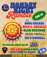 HAPPY HOUR DRINK PRICES ALL NIGHT, plus potluck dinner buffet. The Ramble each week will host a different group of local band members for an all-star band of musicians. Plus select guests sitting in. $10 admission. GUESTS TONIGHT TBA