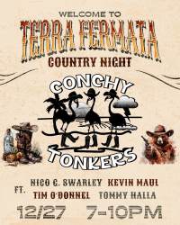$5 admission. Terra debut. If you like classic country, you're gonna love the Conchy Tonkers. Members are Tim O'Donnell, on guitar/pedal steel, Nico G Swarley on bass, Tom Haller on drums. Plus many special guest to come.